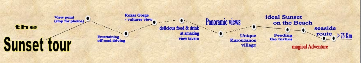 Drive-thru 7 small and beautiful traditional villages, gorges, and olive groves, pass by little farms- stables with goats and sheep, if we will be lucky to see some wild horses, the Sfentili lake to the top of the mountain with the company of eagles, taste a shot of the authentic Cretan tsikoudia with fruits or some small snacks until the magnificent nature’s magical and special moment, sunset on the Beach.